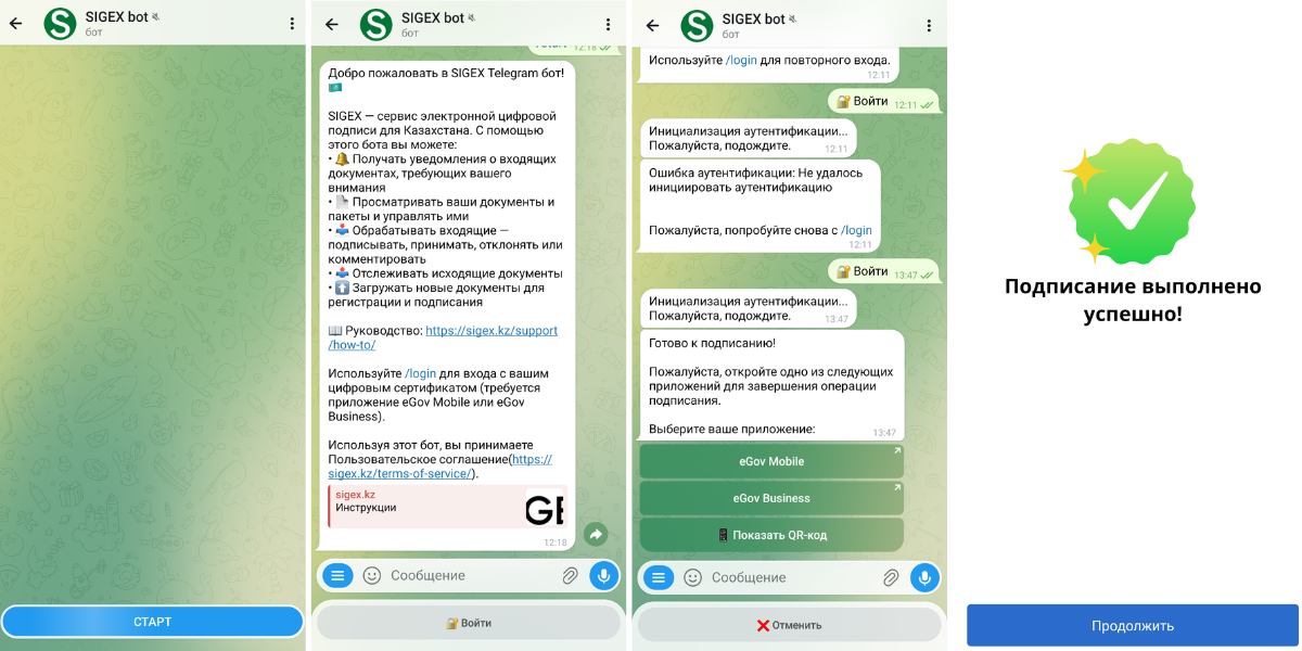 В открывшемся окне приложения eGov нажмите на кнопку «Подписать» и пройдите идентификацию пользователя. При появлении сообщения: «Подписание выполнено успешно» затем нажмите на кнопку «Продолжить». После нажатия кнопки будет выполнен возврат в приложение Telegram.