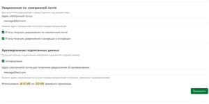 Пользователю доступно архивирование подписанных данных, после активации которого подлинники документов будут сохраняться в личном кабинете пользователя. Также пользователь может включить уведомления о подписании, а также уведомления о входящих и исходящих документах. В таком случае, при отправке документа на подписание, пользователь получит уведомление на указанную почту.