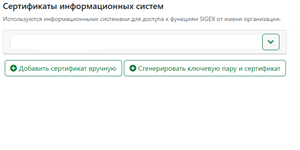 В данном подразделе можно сгенерировать и добавить сертификат mTLS для использования информационными системами при доступе к функционалу сервиса SIGEX от имени организации. Здесь же можно поменять настройки вывода информации об организации (лого, название) впроцессе подписания и формировании карточки документа.