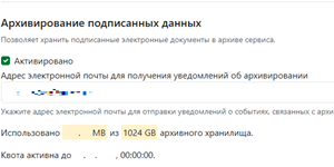 В данном подразделе можно включить функцию архивирования подписанных документов и указать адрес для отправки уведомлений о событиях связанных с архивированием. Здесь же можно уровень заполненности архивного хранилища.