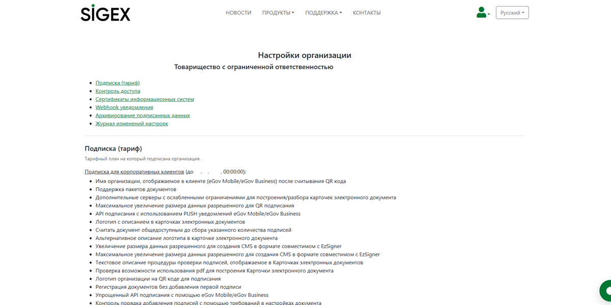 Информацию о настройках организации на сервисе SIGEX можно просмотреть в разделе " Настройки организации “. В этой инструкции мы расскажем о содержимом раздела и его функционале.