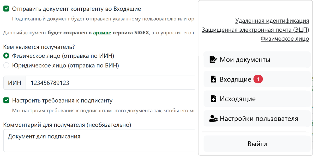 SIGEX позволяет отправлять документы на подписание, зная лишь ИИН или БИН контрагента. Настоящая инструкция описывает шаги по работе с подписанием и отправке Исходящих документов.