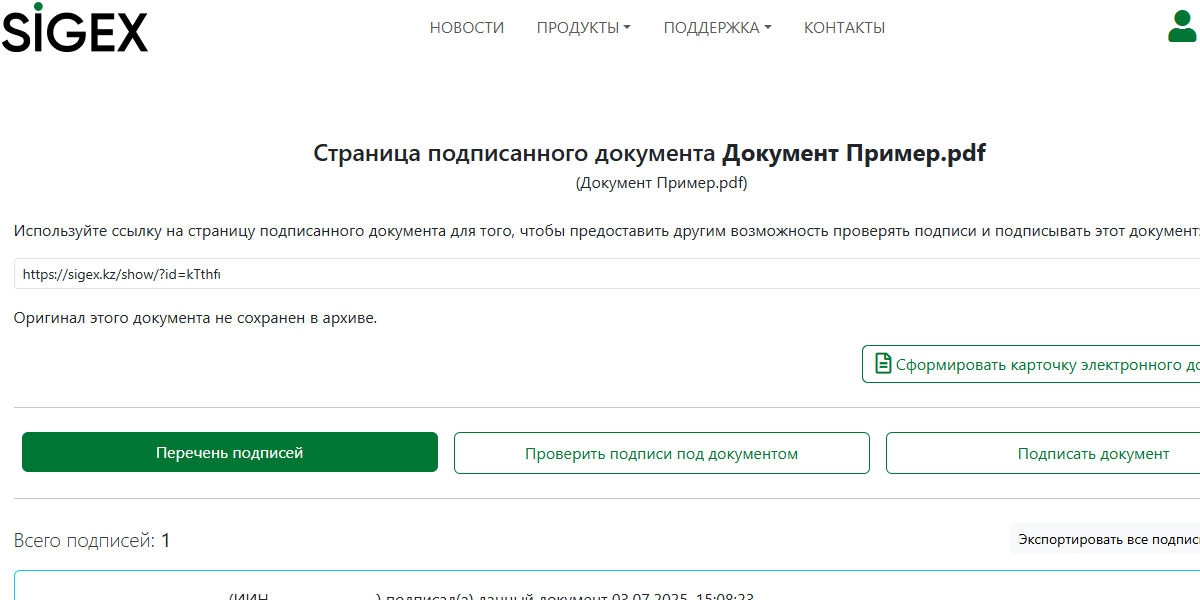 Кликните на кнопку для того, чтобы перейти на страницу подписанного документа. Подлинник документа с идентификатором будет автоматически сохранен на компьютер.