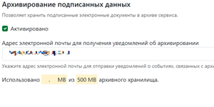 В данном подразделе можно включить функцию архивирования подписанных документов и указать адрес для отправки уведомлений о событиях связанных с архивированием. Здесь же можно уровень заполненности архивного хранилища.